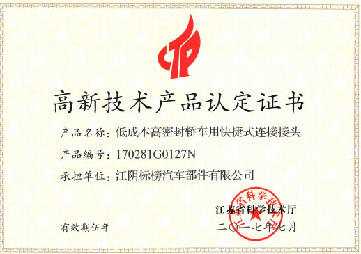 日前,我司低成本高密封轎車用快捷式連接接頭獲江蘇省科學(xué)技術(shù)廳頒發(fā)的高新技術(shù)產(chǎn)品認(rèn)定證書(shū)。