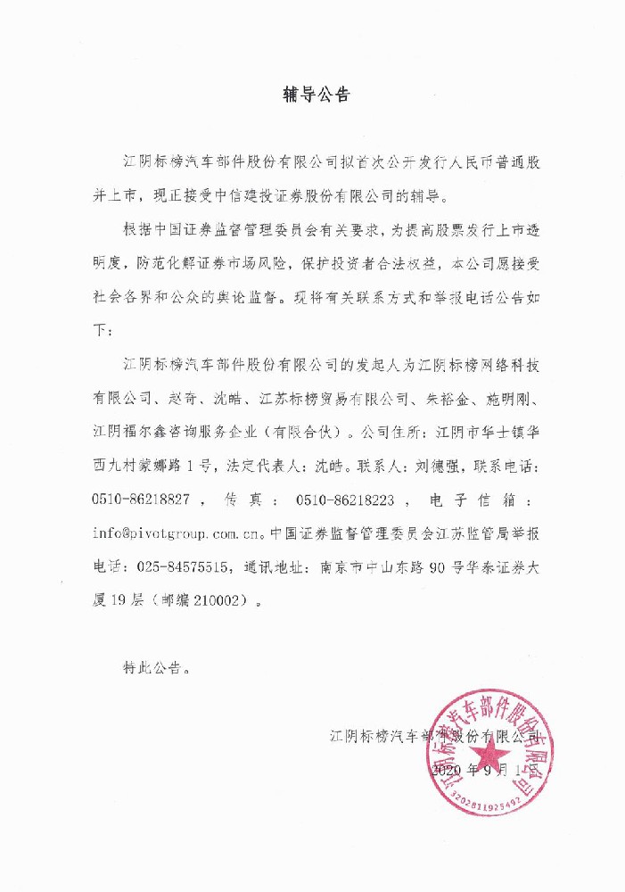 江陰標榜汽車部件股份有限公司擬首次公開發(fā)行人民幣普通股并上市,現(xiàn)正接受中信建投證券股份有限公司的輔導(dǎo)。